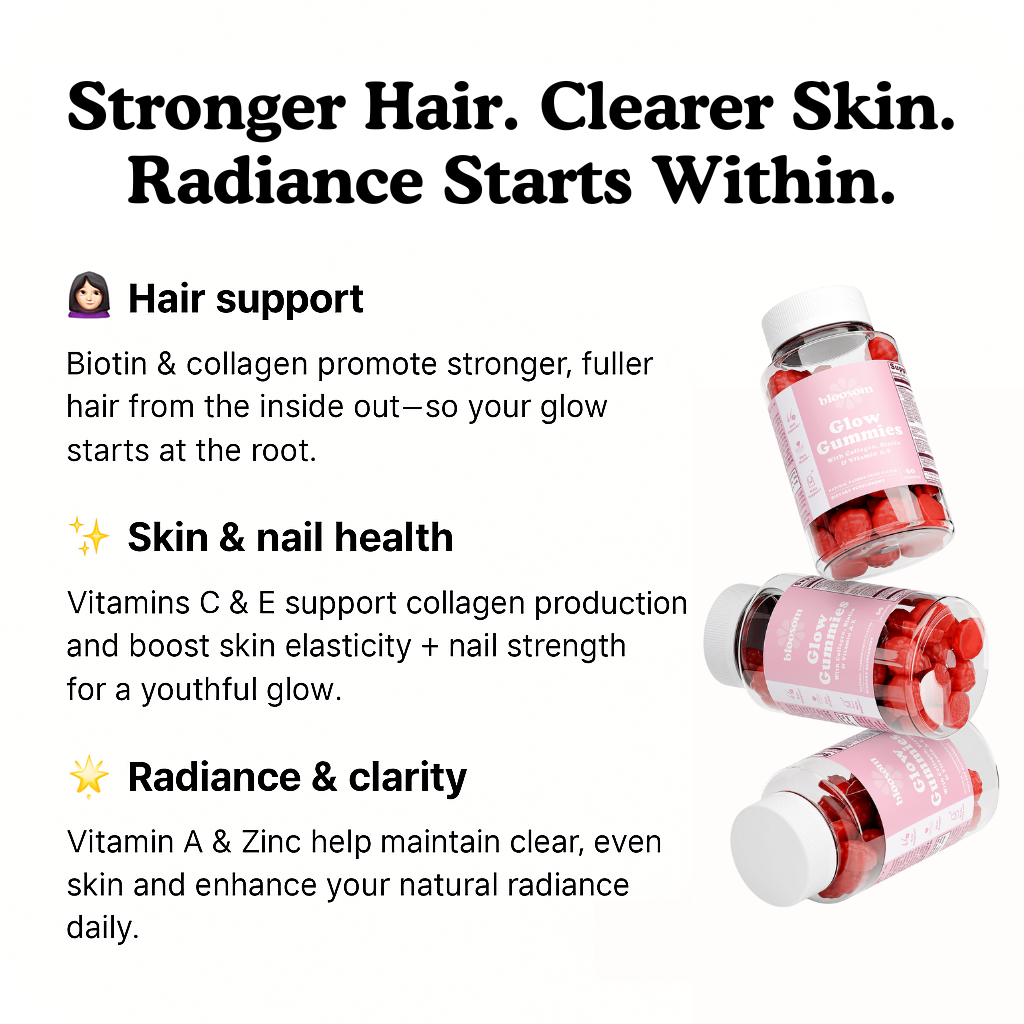 Passion-fruit Glow Gummies with Collagen, Biotin & Vitamins A–E to support hair, skin & nails every day.